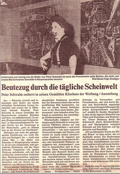 Schwalm besitzt ein ausgesprochen klares Stilempfinden und zweifelsohne großes Talent. Was an seinen Bildern besticht, ist die Direktheit der Aussage. Er braucht dem Betrachter keine Interpretationen aufdrängen; die Bilder sprechen für sich.